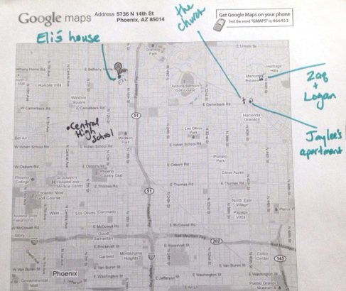 Here is the map I printed off Google Maps for my own reference. I know the physical address for each house/apartment, though when I looked for pictures of houses, I picked a random one for Zaq's house and pretended it was the one right next door to Logan's, when in reality, it is not. (Sorry about the blurriness. I don't have a scanner at present.)